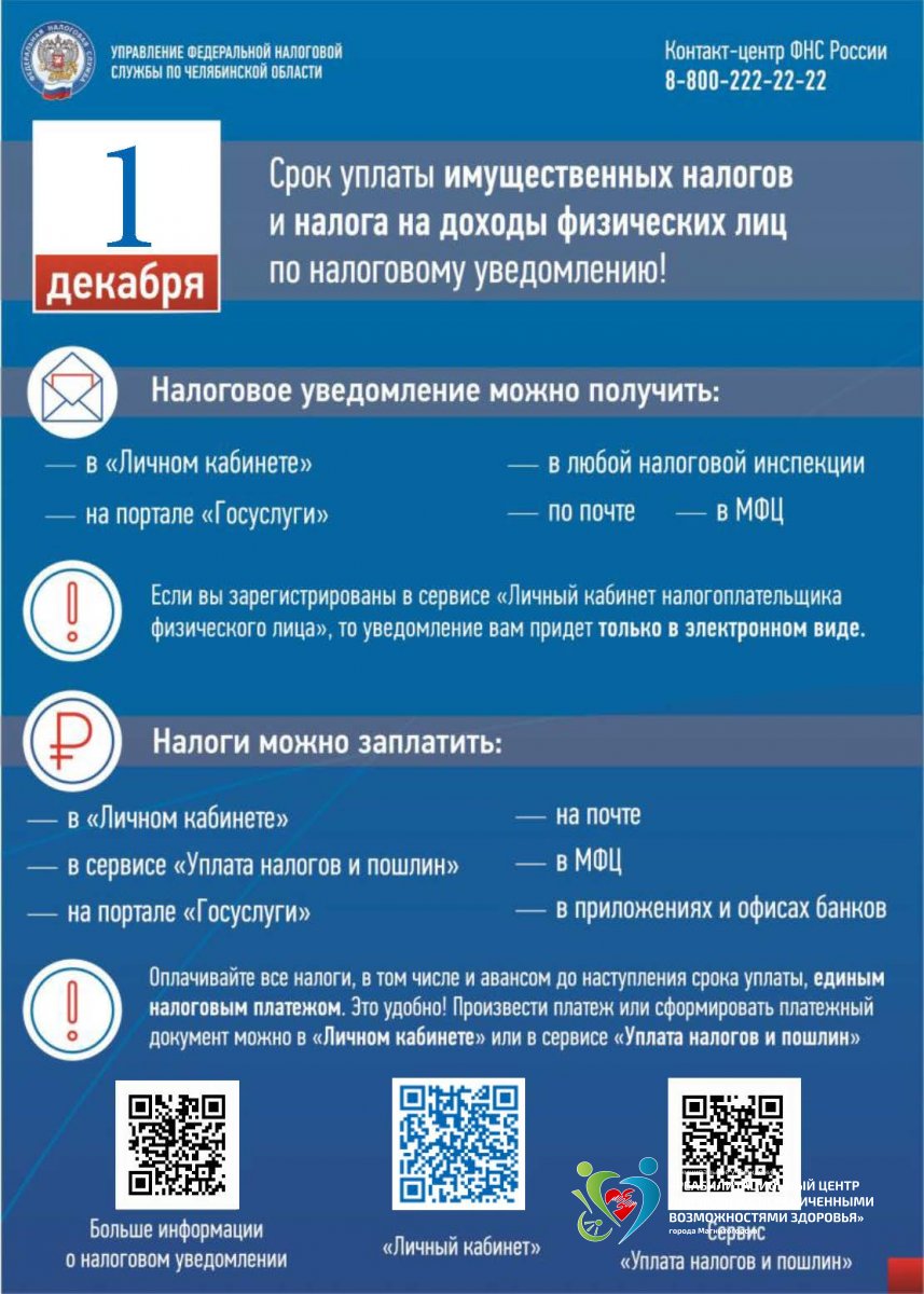 Дорогие друзья! Напоминаем вам, срок уплаты имущественных налогов и налога на доходы физических лиц по налоговому уведомлению!